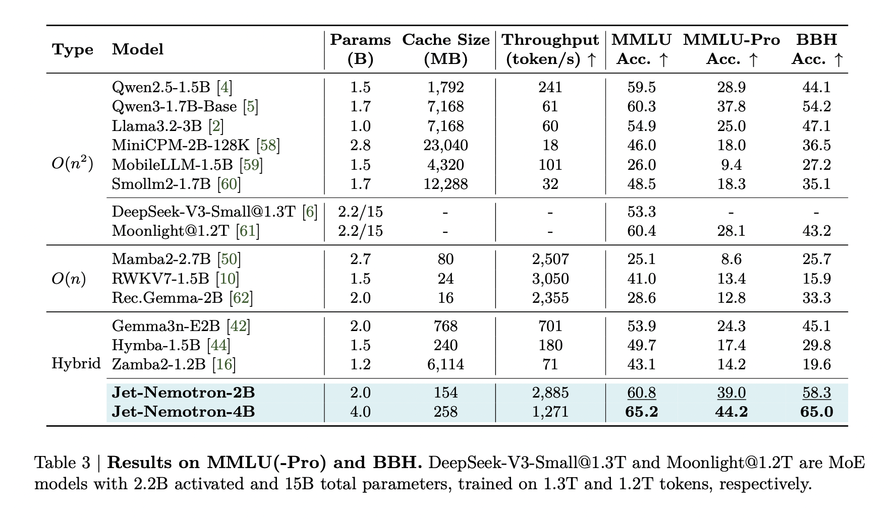 MMLU(-Pro) 和 BBH 上的结果。表 3 将 Jet-Nemotron 与最先进的高效语言模型进行了比较。Jet-Nemotron-2B 实现了比 Qwen3-1.7B-Base 高 47 倍的吞吐量和 47 倍小的缓存大小,同时在 MMLU、MMLU-Pro 和 BBH 上提供了显著更好的准确性。Jet-Nemotron-2B 甚至优于近期的 MoE 模型,如具有更多激活参数(22 亿)和总参数(150 亿)大得多的 DeepSeek-V3-Small [6] 和 Moonlight [61]。当扩展到 40 亿参数时,Jet-Nemotron-4B 相对于 Qwen3-1.7B-Base 仍保持 21 倍的吞吐量优势。与其他线性注意力和混合模型相比,Jet-Nemotron 也实现了显著更高的准确性。