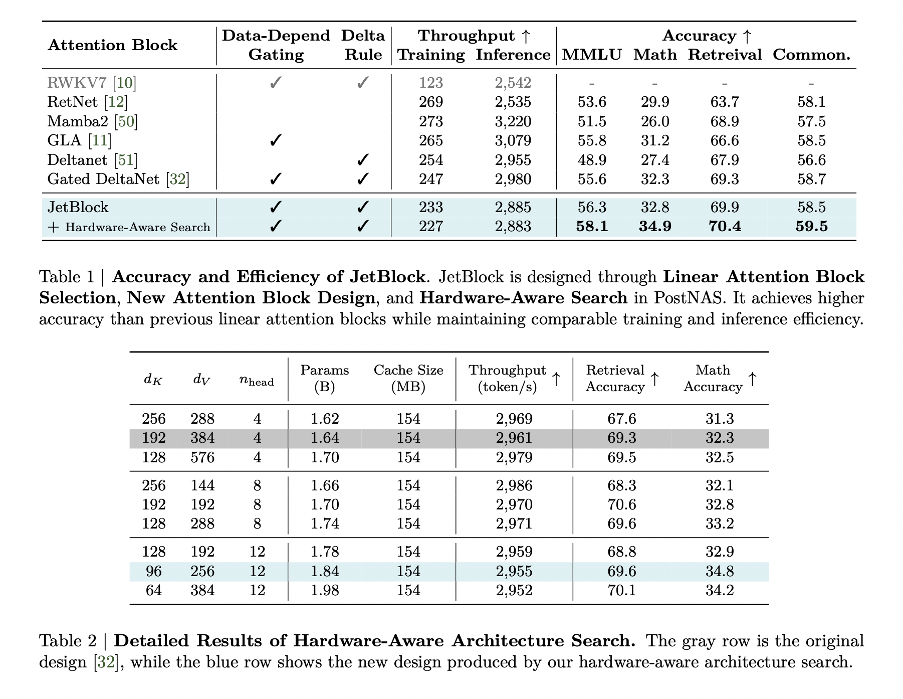 基于发现 4,我们固定 KV 缓存大小以匹配原始设计,并对键维度、值维度和注意力头数量进行小规模网格搜索。表 2 总结了结果,其中所有变体使用相同的线性注意力块(即 Gated DeltaNet),但具有不同的配置。蓝色行代表我们的最终设计,而灰色行对应原始设计。我们的最终配置实现了与原始设计相当的生成吞吐量,同时包含了更多参数并提高了准确性。从表 1 可以看出,我们在 PostNAS 中的硬件感知搜索提升了 JetBlock 的准确性,同时保持了训练和推理吞吐量。