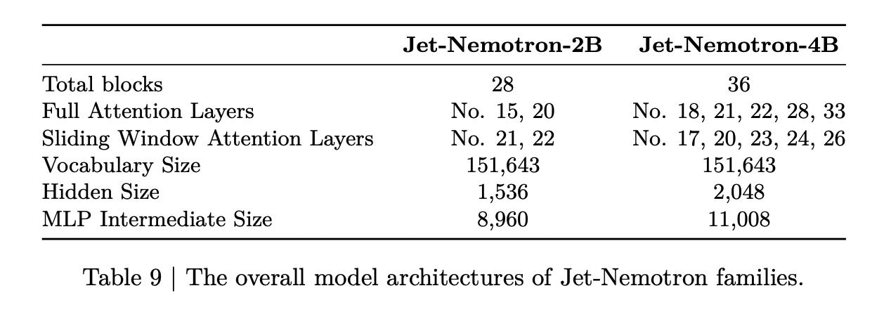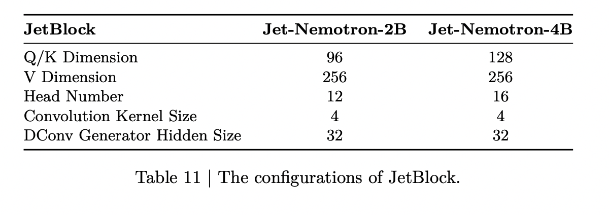 全注意力和滑动窗口注意力层使用分组查询注意力 [105],并按表 10 进行配置。对于滑动窗口注意力层,在 Jet-Nemotron-2B 中窗口大小设置为 1,152,在 Jet-Nemotron-4B 中设置为 2,048。