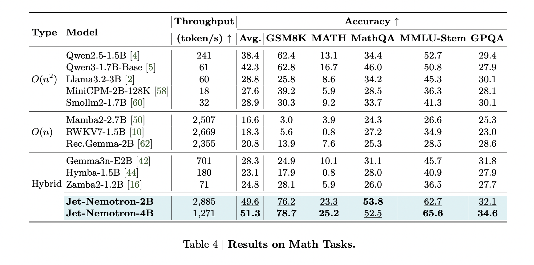 数学任务上的结果。表 4 报告了我们在数学任务上的结果。Jet-Nemotron-2B 实现了 49.6 的平均准确率,以 6.3 的优势超过 Qwen3-1.7B-Base,同时速度快 47 倍。相比之下,先前的线性注意力和混合模型在数学任务上远远落后于 Qwen3。