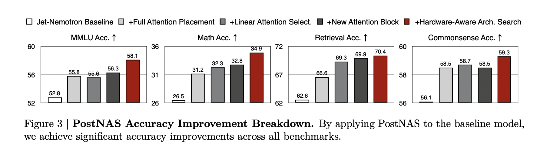 图 2 展示了 PostNAS 的路线图。从一个预训练的全注意力模型开始,它冻结 MLP 权重,并通过四个关键步骤以从粗到细的方式探索注意力块设计:全注意力放置与消除(第 2.2 节)、线性注意力块选择(第 2.3 节)、新注意力块设计(第 2.4 节)和硬件感知架构搜索(第 2.5 节)。图 3 显示了这些步骤带来的准确性改进分解。我们观察到所有基准测试都有显著的准确性提升:MMLU +5.3,数学 +8.4,检索 +7.8,常识推理 +3.2。