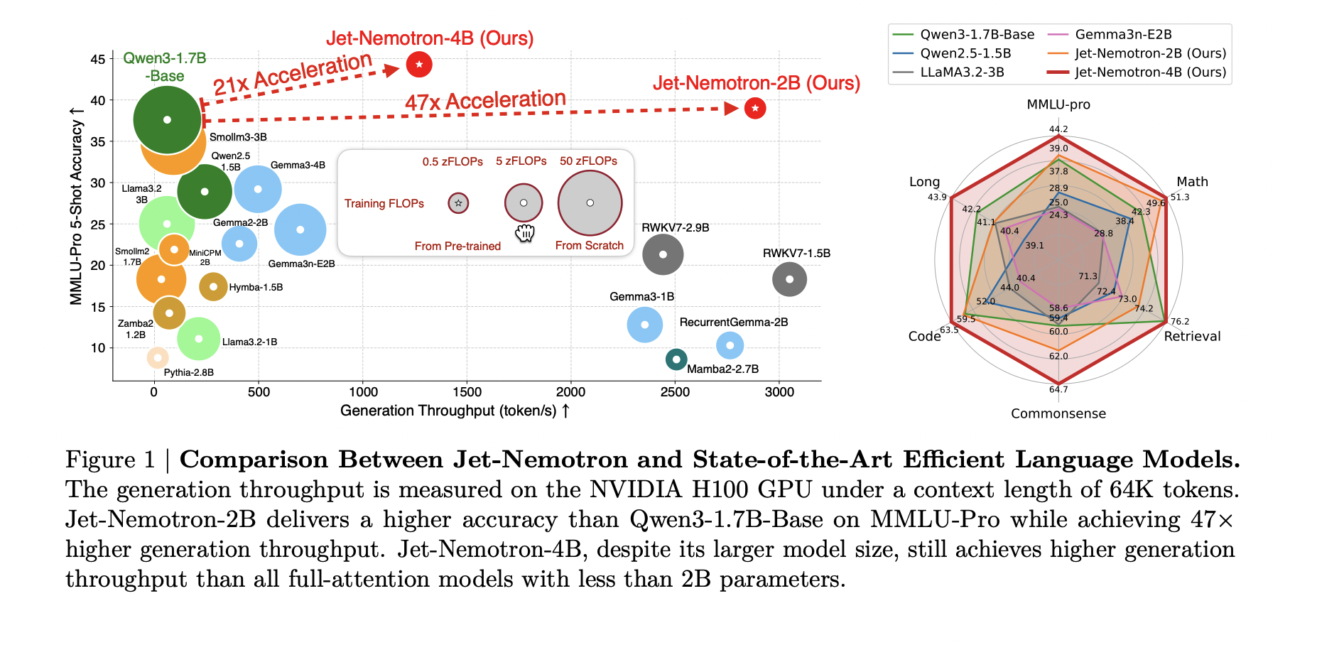 我们推出了 Jet-Nemotron,一个新的混合架构语言模型系列,它在性能上超越了最先进的全注意力模型——包括 Qwen3、Qwen2.5、Gemma3 和 Llama3.2——同时提供了显著的效率提升,在 H100 GPU 上(256K 上下文长度,最大批处理大小)生成吞吐量提升高达 53.6 倍。Jet-Nemotron 的实现得益于两项关键创新:(1) 后神经架构搜索(Post Neural Architecture Search),一种高效的训练后架构适应流程,适用于任何预训练的 Transformer 模型;以及 (2) JetBlock,一种新颖的线性注意力块,其性能显著优于先前的设计,如 Mamba2、GLA 和 Gated DeltaNet。大量的实证结果表明,Jet-Nemotron 在广泛的基准测试中实现了重大的效率改进,同时没有牺牲准确性。此外,Jet-Nemotron 显著降低了与 LLM 架构探索相关的成本和风险,使得语言模型设计的创新更快、更高效。