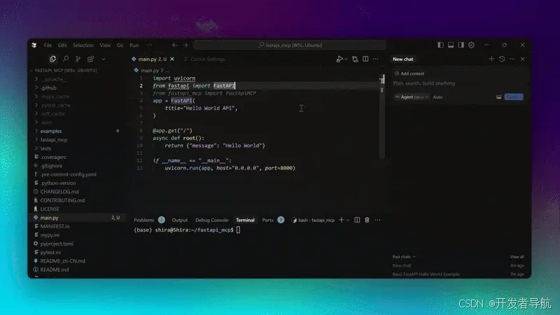 - 安装框架,推荐使用 uv:uv add fastapi-mcp,或使用 pip:pip install fastapi-mcp