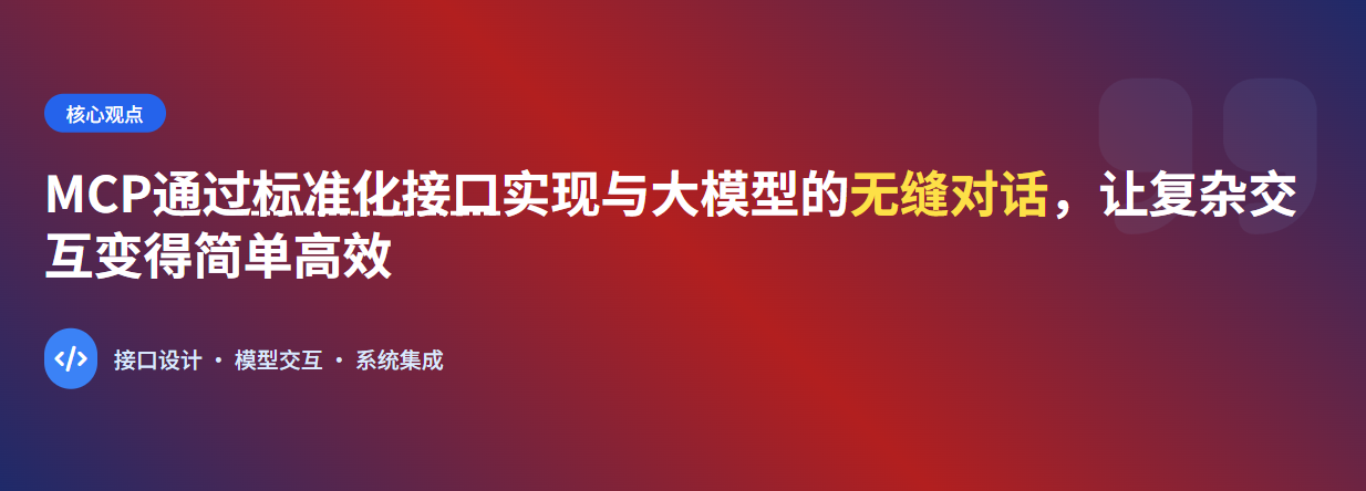 MCP(Model Context Protocol)是一个开放标准协议,它定义了大模型与外部工具和服务之间的通信规范。简单来说,MCP就是大模型的"翻译官",让AI能够理解并调用各种外部功能。