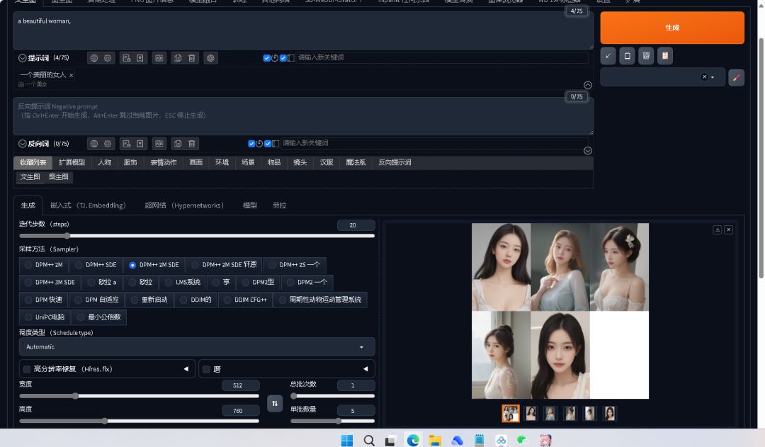 5、最终的效果。例如:输入一个关键词“一个美女”,点击“生成”,结果效果图如下: