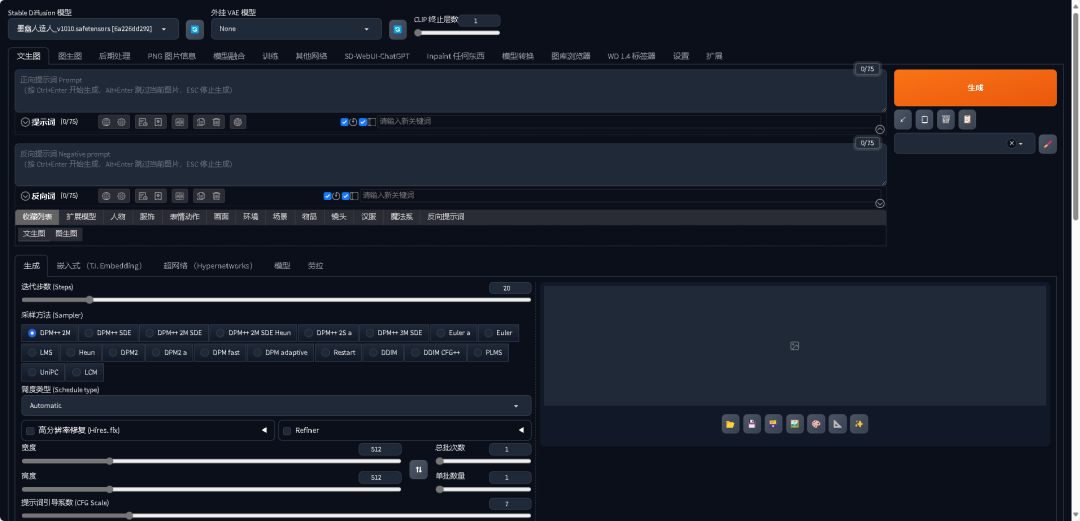 大模型:是通过大量素材和SD基础模型(如SD1.5/SD1.4/SD2.1)进行深度学习后生成的,可以直接用于图像生成,决定了最终生成图像的大方向。大模型的文件格式通常为CKPT或SAFETENSORS。