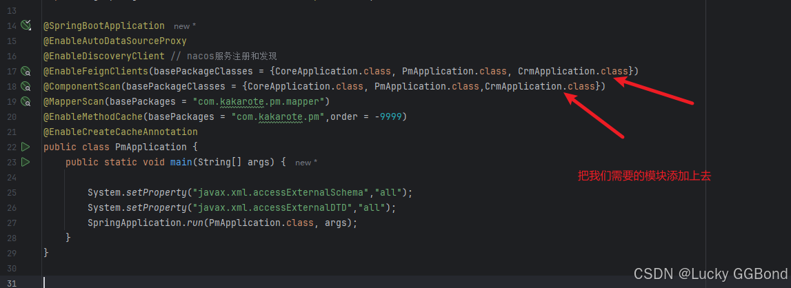 | @EnableFeignClients | 启用Feign客户端,跨模块调用时需要扫描对应模块的Feign接口 |