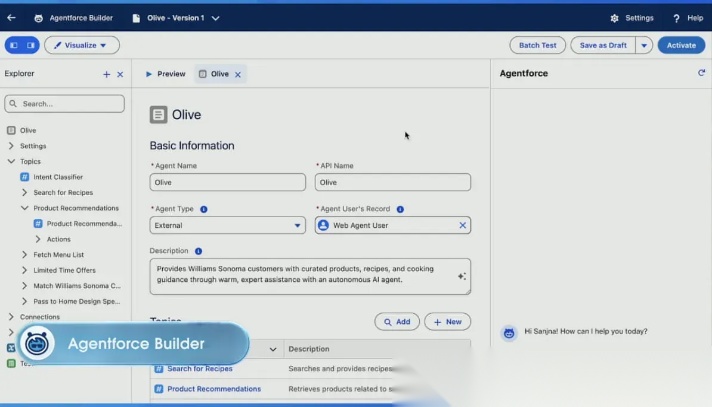Williams-Sonoma 部署了名为 Olive 的 AI 厨房助手,它不仅能推荐食谱和烹饪视频,还能根据客户购买的厨具(如荷兰烤锅)定制内容。关键在于,Olive 能访问客户的购买历史、浏览行为、会员等级,因此推荐的精准度远超通用 AI 助手。这个agent在发布首周末就上线,体现了 AgentForce 的快速部署能力。