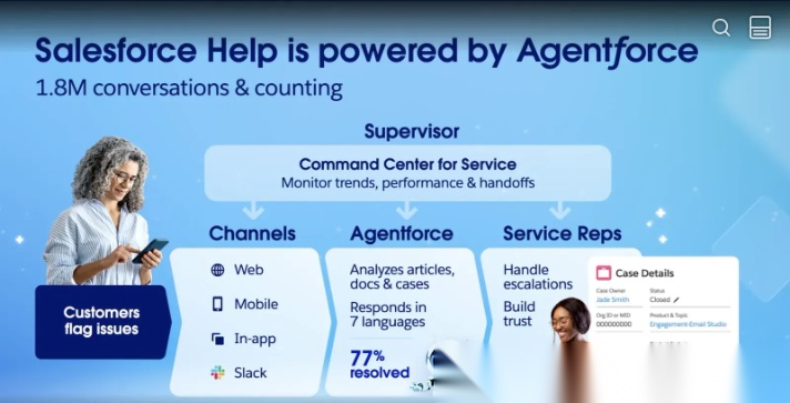 从 2024 年 10 月 AgentForce 发布至 2025 年 7 月,他们在自家客服系统(http://help.salesforce.com) 上累计完成 160 万次 AI 驱动的客户对话。