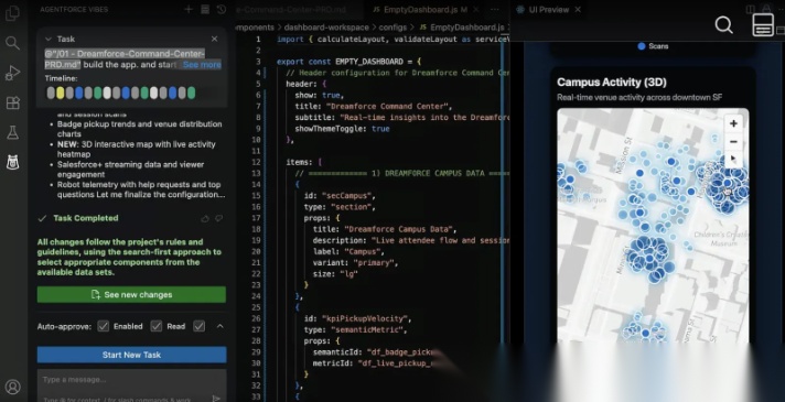 在 Dreamforce 演示中,一个 Dreamforce 指挥中心应用同时调用了数据分析agent、地图可视化agent、流程自动化agent。