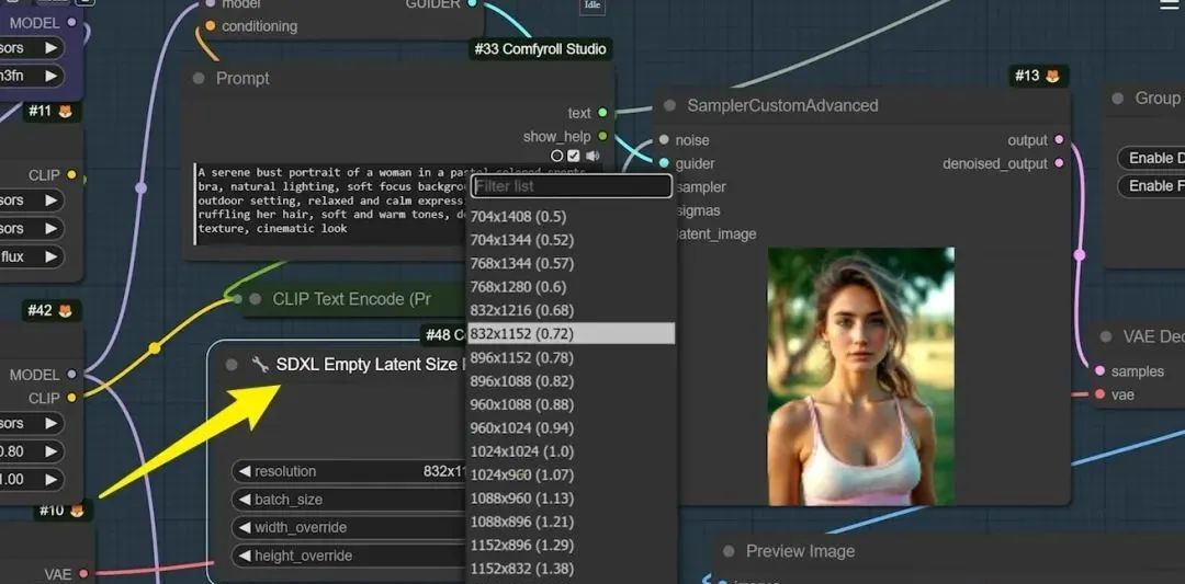 在Flux的创意图像生成流程中,我发现了一个巧妙的优化点。原本用于设定图像尺寸的节点,现在被我升级为一个更为智能的选择——SDXL Empty Latent Size节点。这个新节点不仅简化了操作,还赋予了用户更大的灵活性:你只需轻轻一点,即可从多种SDXL图像尺寸中挑选心仪的选项。而且,由于Flux对各种长宽比都游刃有余,无论是想要制作标准尺寸还是特殊比例的图像,只需借助基础的“Empty La