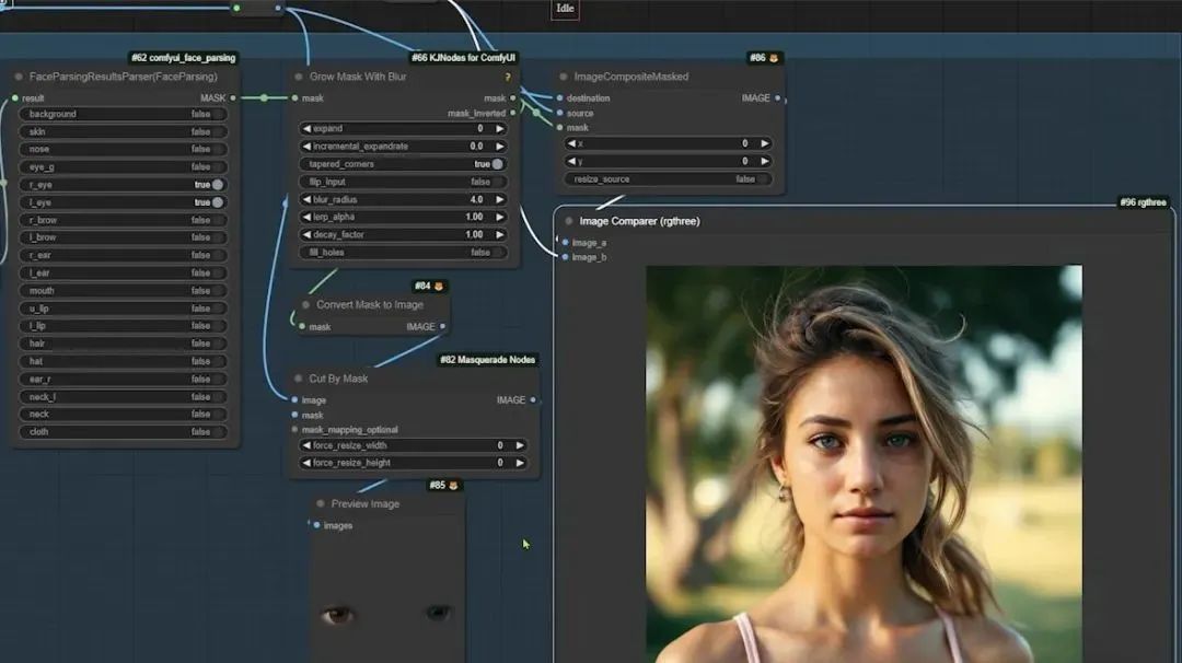 然后,使用另一个节点选择“眼睛”并创建蒙版。使用“模糊增长遮罩(Grow Mask With Blur)”节点可以调整遮罩的大小或使其模糊。