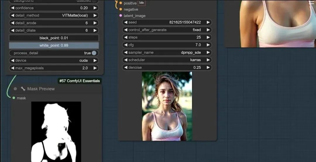 - 探索一款革命性的节点工具,它专门设计用于精确地分离人物的脸部、头发和身体。这个先进的遮罩技术覆盖了所有关键区域,尽管在区分皮肤色调方面还有待提高——比如,它有时会忽略胸部的微妙阴影,或者将运动背心上的反光误判为皮肤。但别担心,这种小瑕疵并不妨碍它捕捉到人物形象的核心要素。事实上,只要关键特征被准确识别,这项技术就能显著提升图像的细节和真实感。