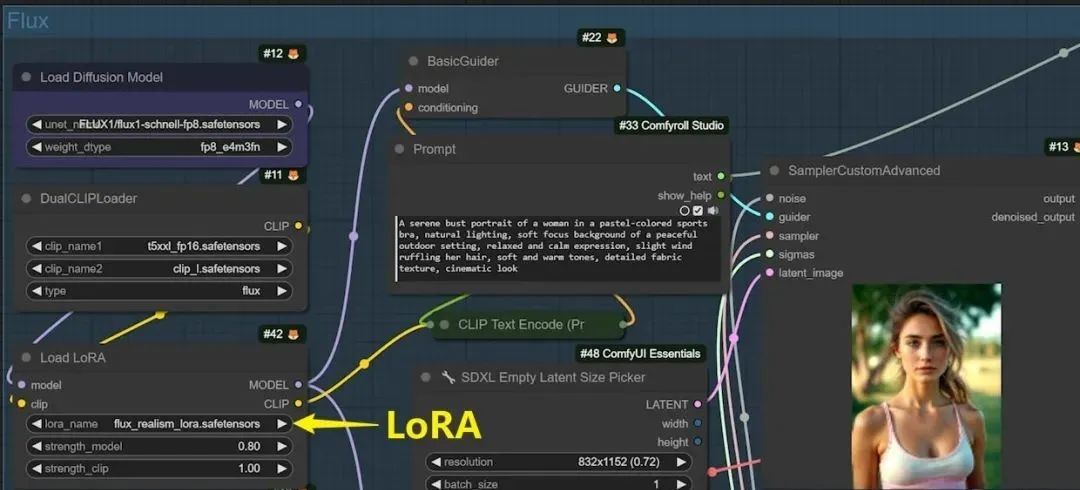 在这个示例中,我选择了“schnell fp8”模型来实现卓越的性能,但请放心,您同样可以选择其他Flux模型来满足您的需求。为了进一步提升体验的真实感,我还巧妙地融入了LoRA技术。这种精心设计的组合确保了结果的逼真度和深度,让您的项目在视觉和功能上都达到新的高度。