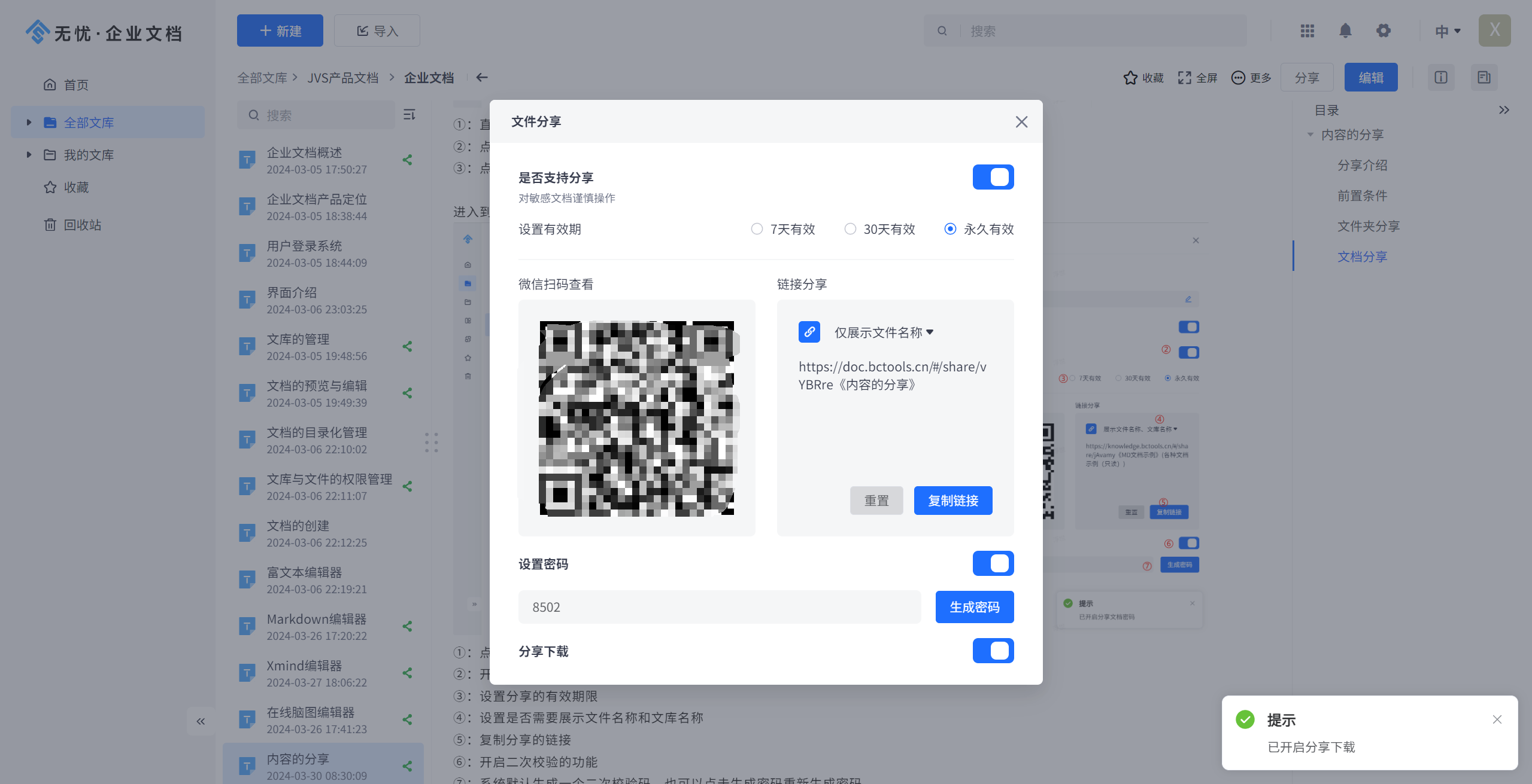 知识的共享:提供文档分享功能支持设置分享有效期,密码二次校验设置、分享下载