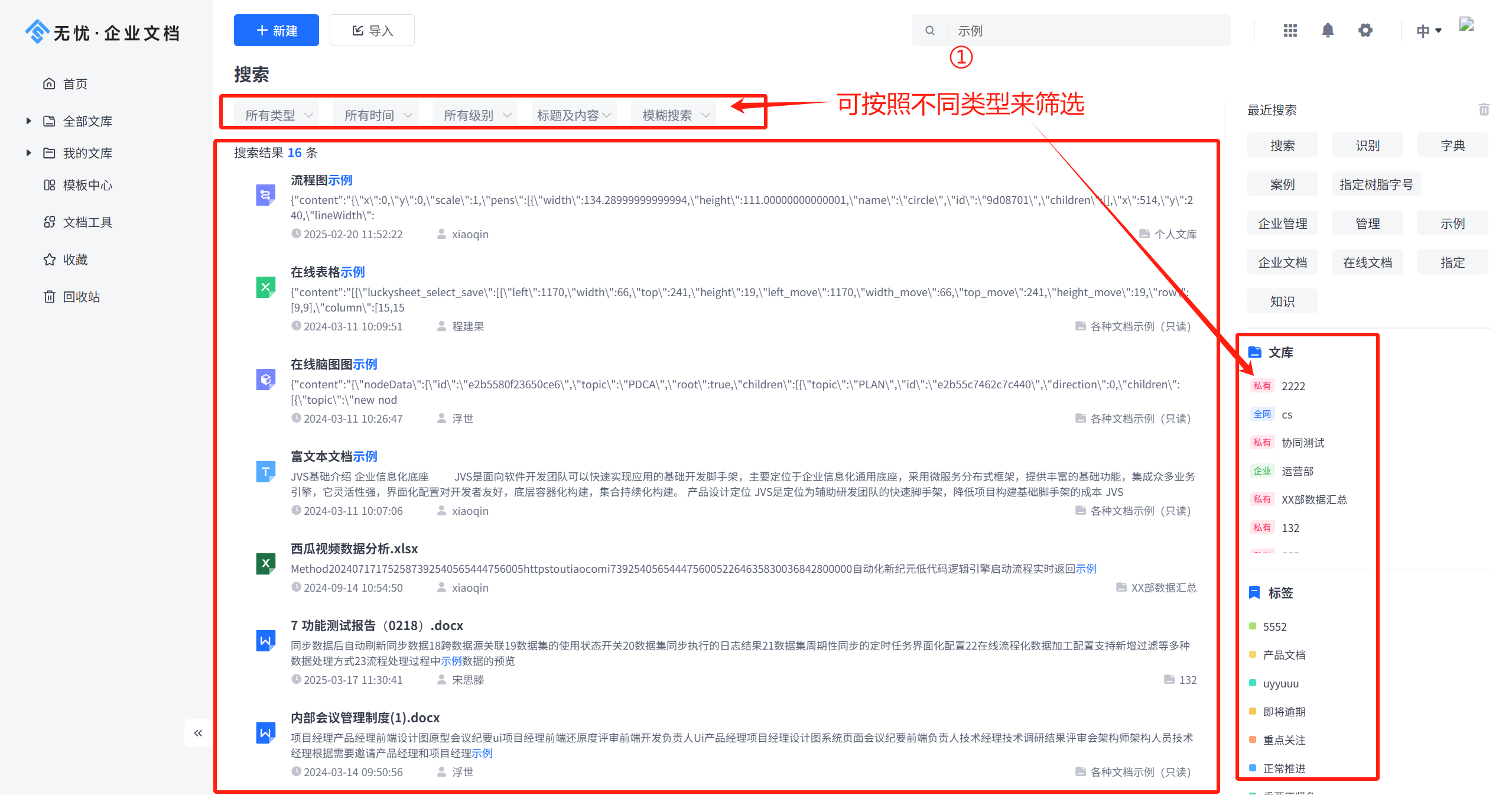 强大的搜索引擎:无忧企业文档内置企业级搜索引擎,支持基于标题和内容的搜索,帮助用户快速找到所需文件,搜索结果达到秒级跳转。注:该搜索结果只展示有查阅权限及其他操作权限的内容。
