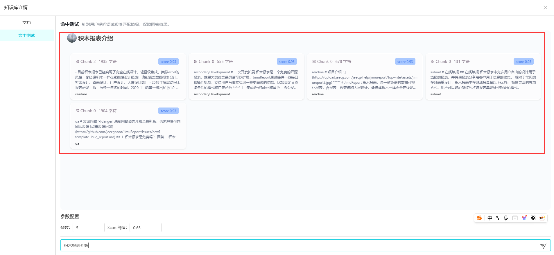 在"命中测试"中,输入问题,可查看命中率及命中片段