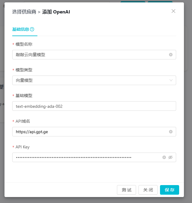 text-embedding-ada-002。 - API 域名:供应商提供的 API 地址。