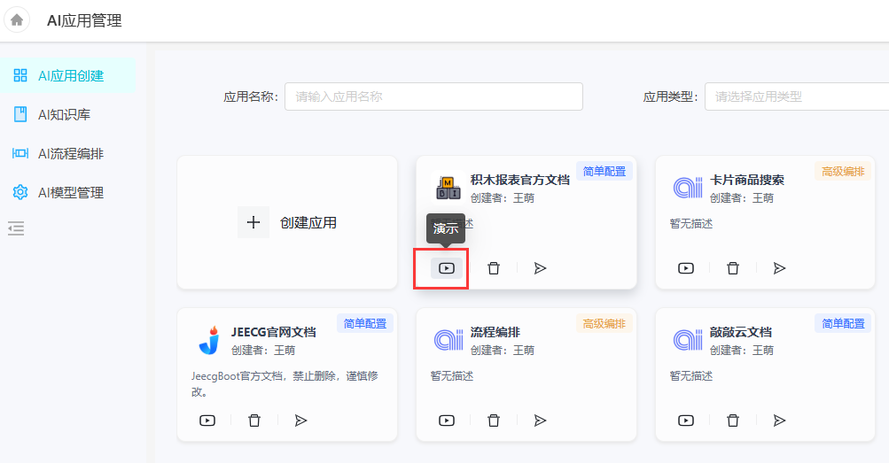 - 在"AI应用创建"中,找到添加好的积木报表AI应用,点击演示即可进入AI客服演示界面