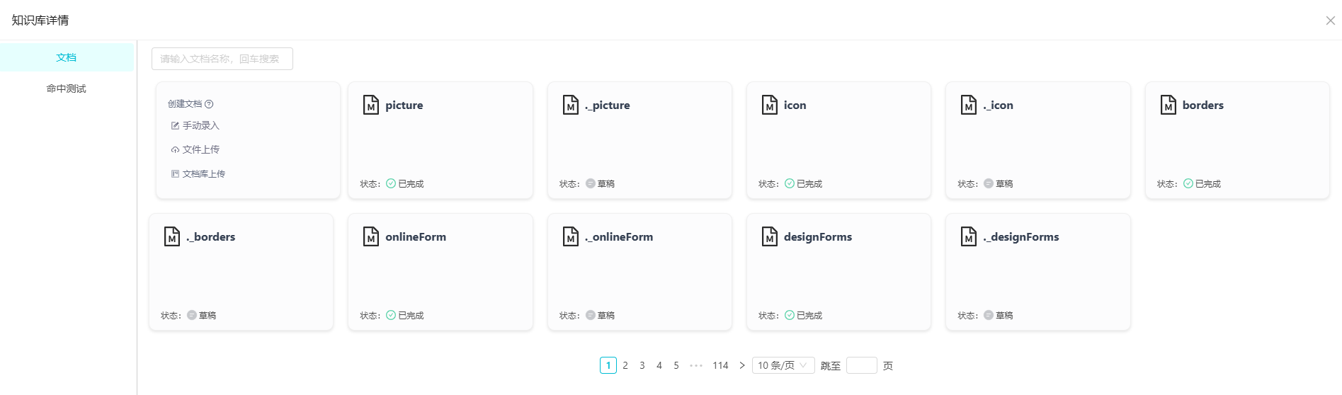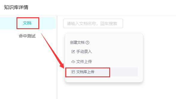 - 点击创建的知识库,在"文档"中,点击"文档库上传"