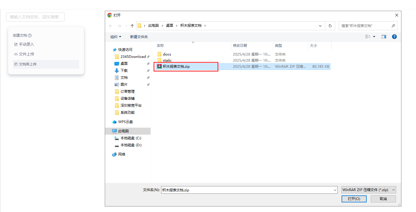 - 选择积木报表文档zip文件,上传即可