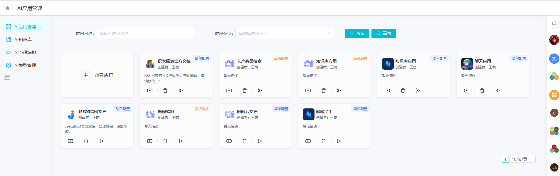 登录进入敲敲云后,点击"AI应用"进入AI功能管理界面,咱们会用到"AI模型管理"、“AI知识库”、"AI应用管理"这三大模块。