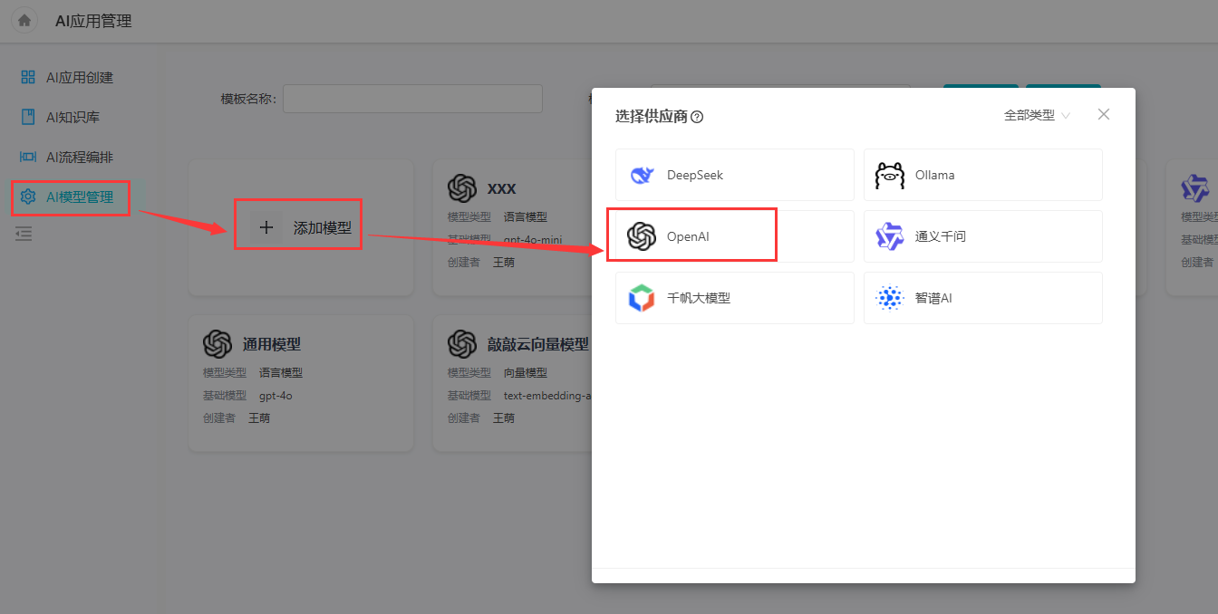 语言模型用于AI应用管理中,在“AI模型管理”中,点击“添加模型”,选择所需要的供应商