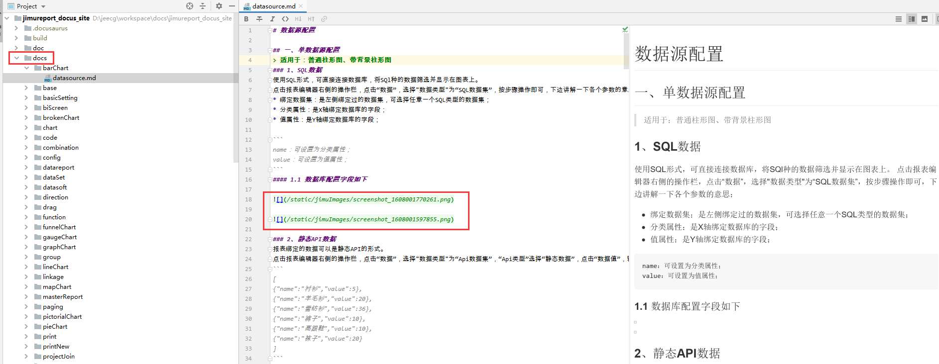docs目录下存放了积木报表、大屏设计器和仪表盘设计器的所有文档,文档格式为markdown格式,并且文档中也包含图片。