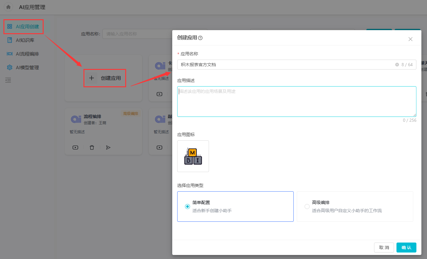 进入"AI应用创建",点击创建应用,填写应用信息即可创建应用