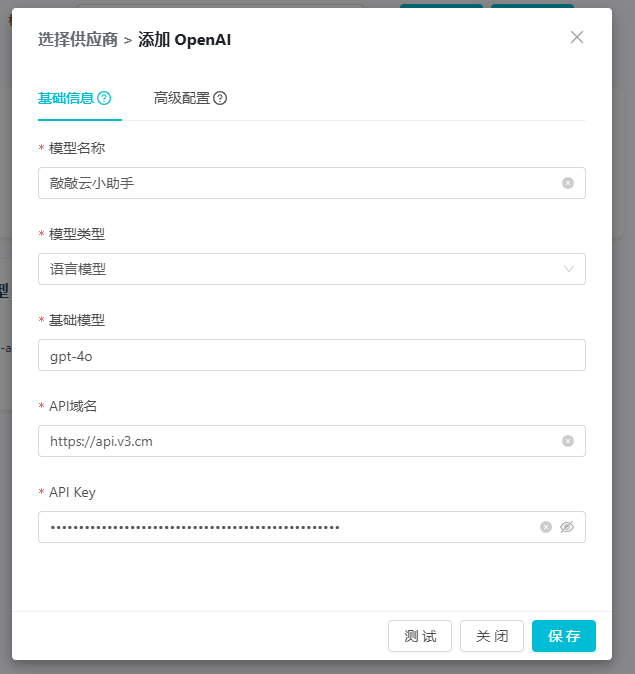 gpt-4o。 - API 域名:供应商提供的 API 地址。