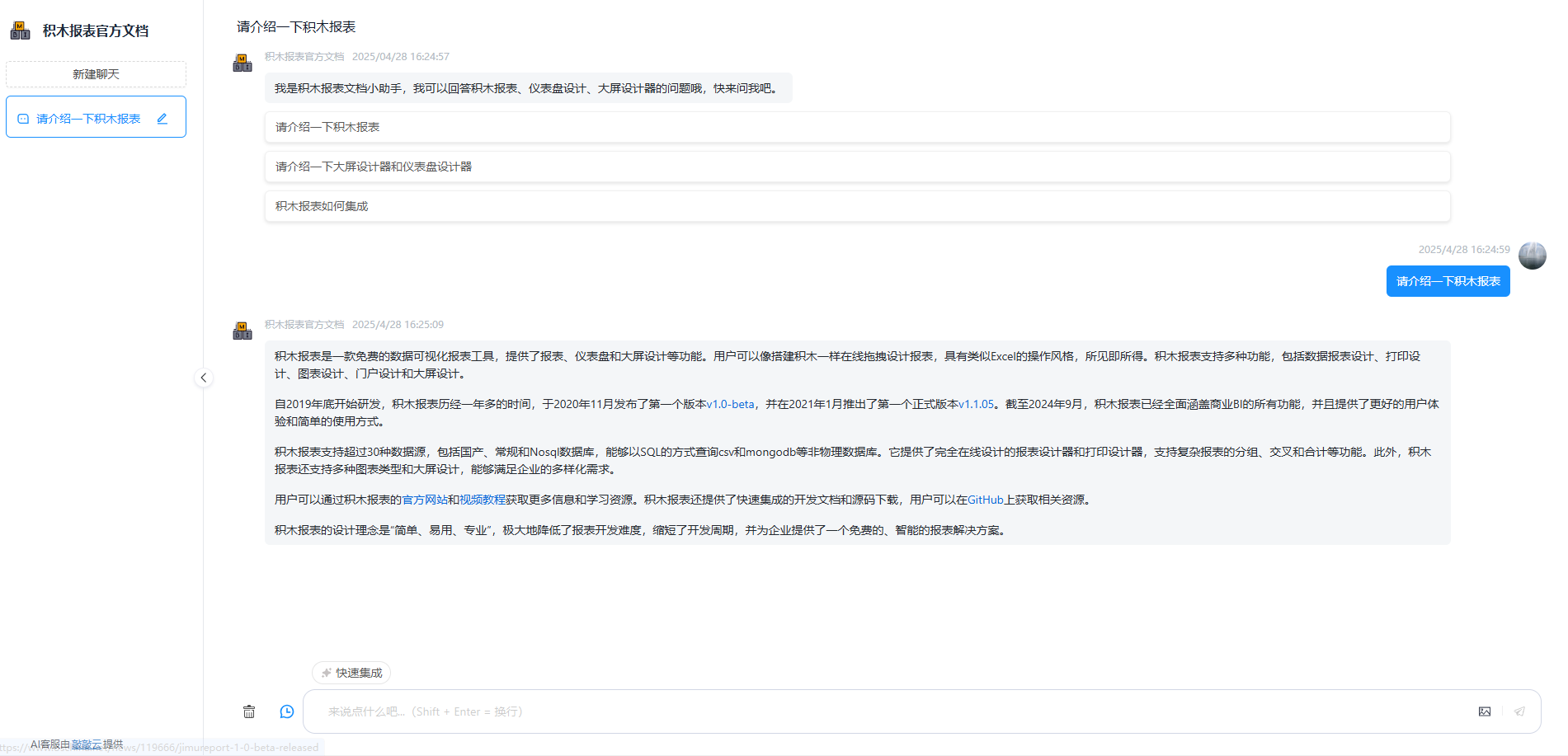 目前,积木报表和JeecgBoot这两个国内知名的开源项目,已经通过 敲敲云 实现了在线AI客服能力。大家可以先体验一下效果。