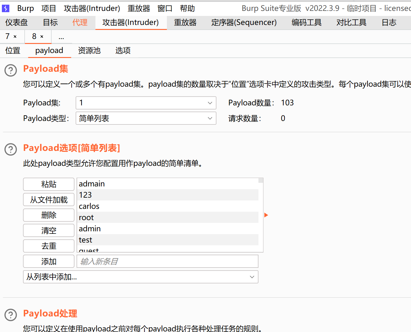 intruder自动化攻击模块,可以导入字典,设置关键字