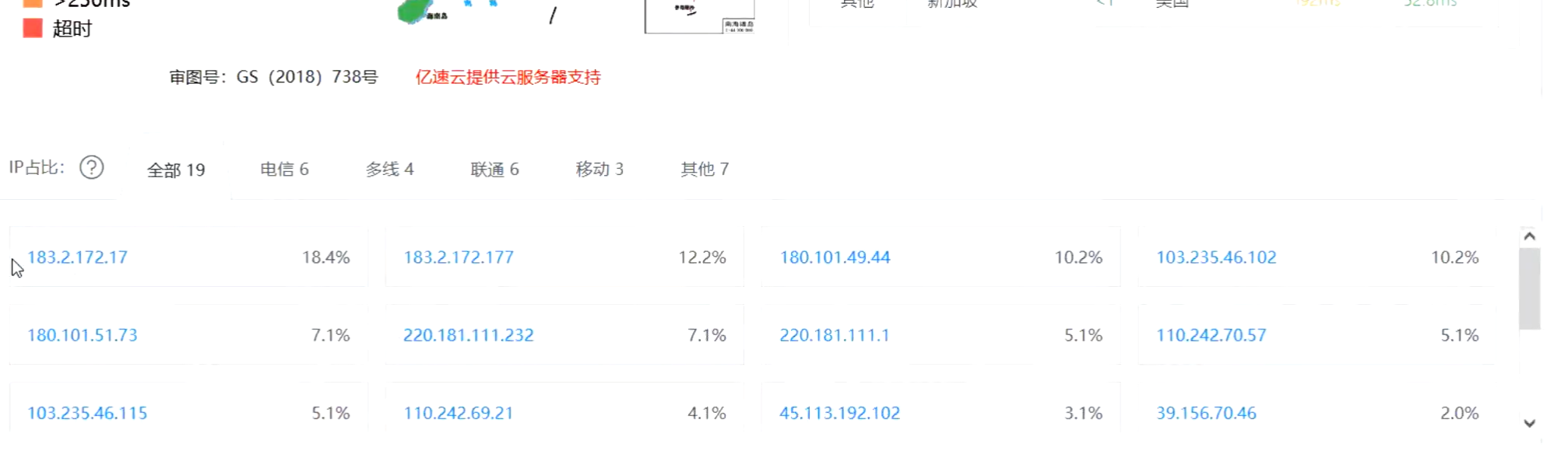 多地ping的另外一种情况就是,当我们的结果是两个或者三个的时候,并且这些地址都是在同一个地区,只不过是不同运营商。这些地址很可能都是我们服务器的出口地址。服务器是放在内网的。