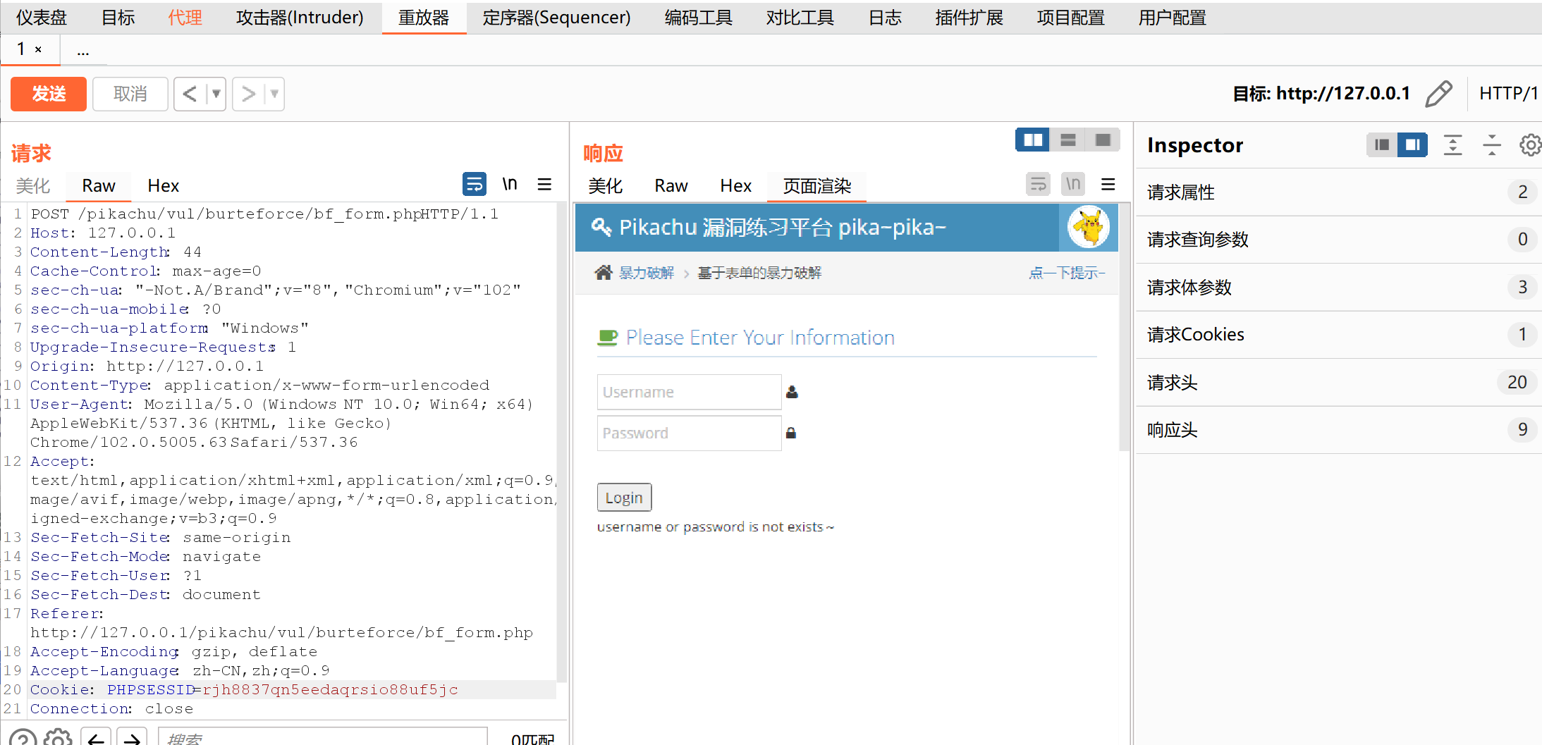 先把请求包放入重放器,手动尝试几次密码