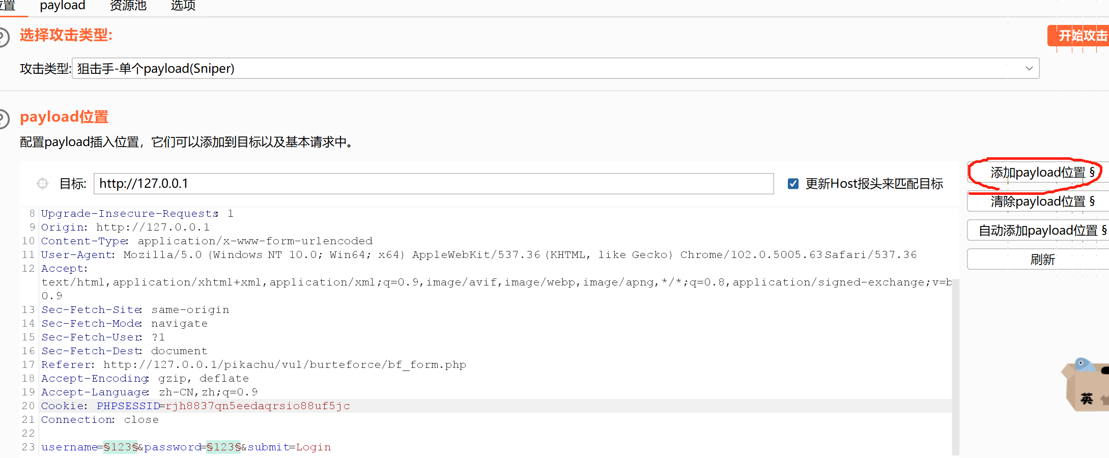 给username和password添加payload值,这样添加字典后会自动化进行爆破这两个值