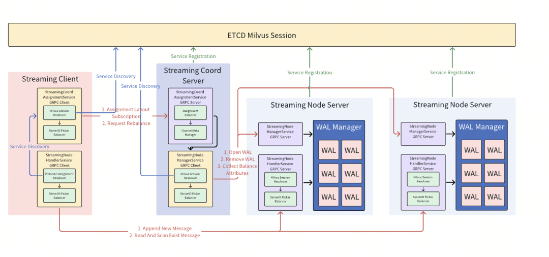 除了 Woodpecker,Milvus 2.6 还引入了 Streaming Service —— 一个专用于日志接入、增量写入与实时订阅的核心组件。它取代了 Kafka/Pulsar 在数据链路中的角色,成为真正意义上的实时数据流通引擎。