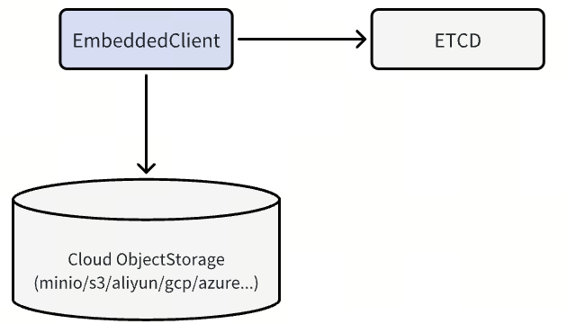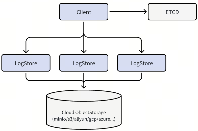 Woodpecker 采用 “ZeroDisk” 架构,所有日志数据存储于云对象存储(如 Amazon S3、GCS、阿里 OSS),元数据则由 etcd 等分布式 KV 系统管理。这种设计彻底消除了本地磁盘依赖,降低了运维压力,并提升了数据持久性和扩展能力。