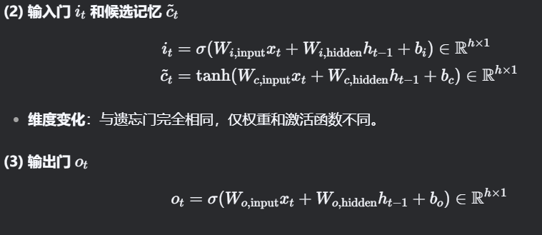 维度变化:与遗忘门完全相同,仅权重和激活函数不同。