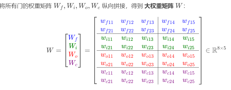 每个门(遗忘门 f、输入门 i、输出门 o、候选记忆 c~)的权重矩阵 W∗ 均分为两部分: