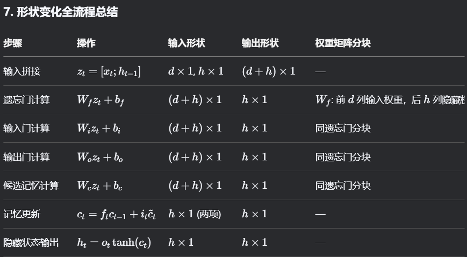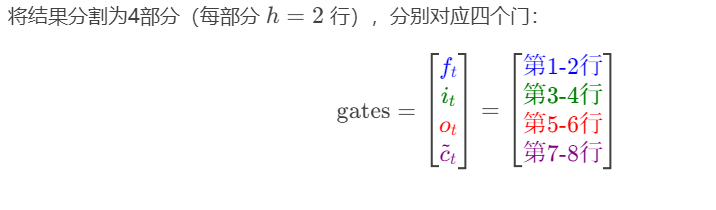 示例维度:假设 d=3(输入维度),h=2(隐藏层维度),则 W∈R 4h×(d+h)=R 8×5。