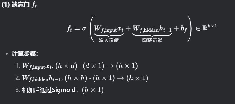 ft=σ(Wf,inputxt⏟输入贡献+Wf,hidden ht−1⏟隐藏贡献+bf)∈R h×1