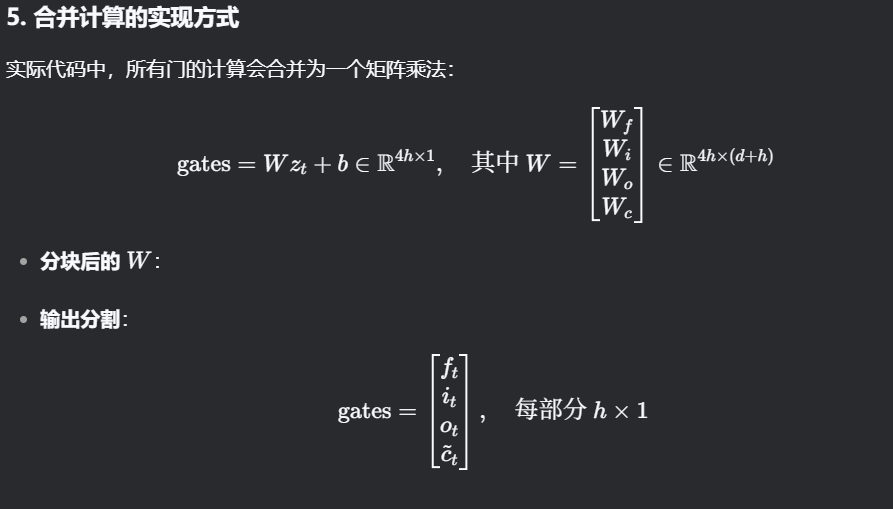 实际代码中,所有门的计算会合并为一个矩阵乘法: