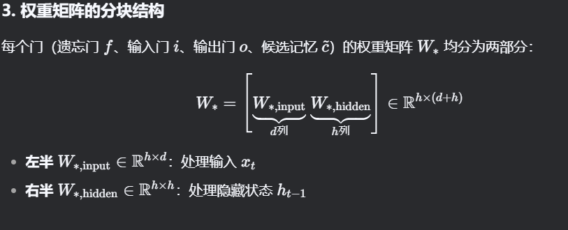 = W_f[:, :d] @ x_t + W_f[:, d:] @ h_{t-1} # 列分块乘法
