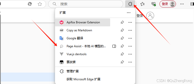 搜索Page Assist,点击获取即可安装。安装好后点击右上角的扩展图标-Page Assist插件打开交互页面
