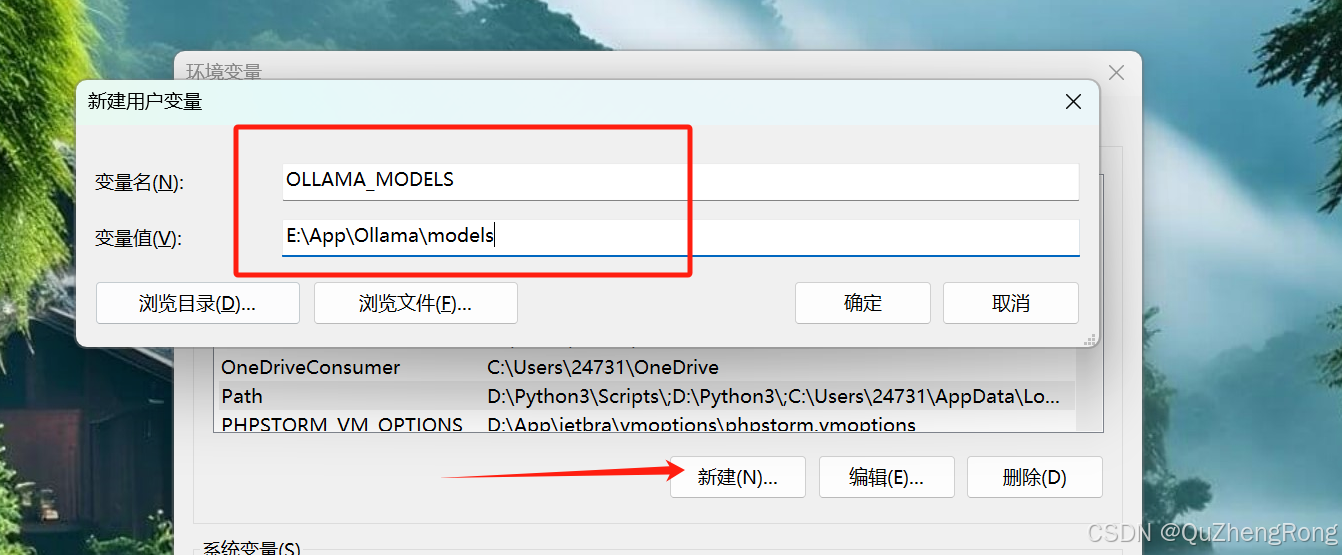 在系统变量位置新建一个叫做OLLAMA_MODELS的变量,变量的值是我们之前创建的models文件夹所在的路径