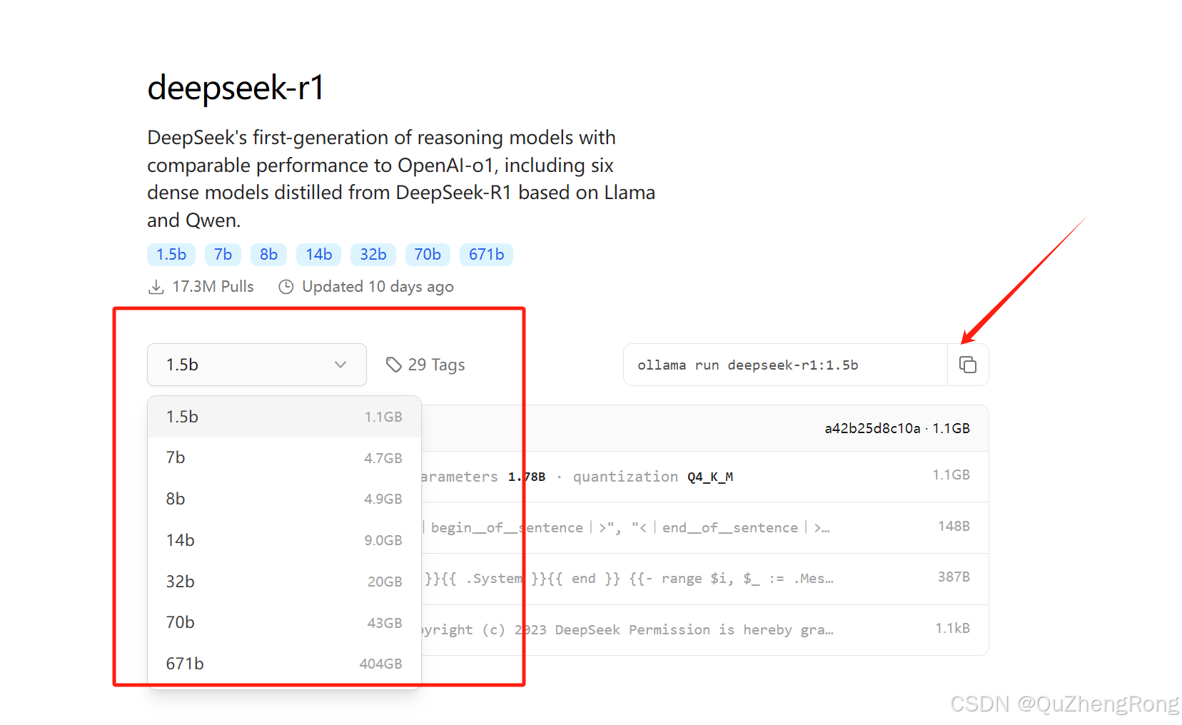 官网列出了不同大小的deepseek模型,一般来讲模型越大参数越多模型也就越智能,我们选择最小的1.5b模型来做实验,其中b是billion的缩写,表示十亿个参数