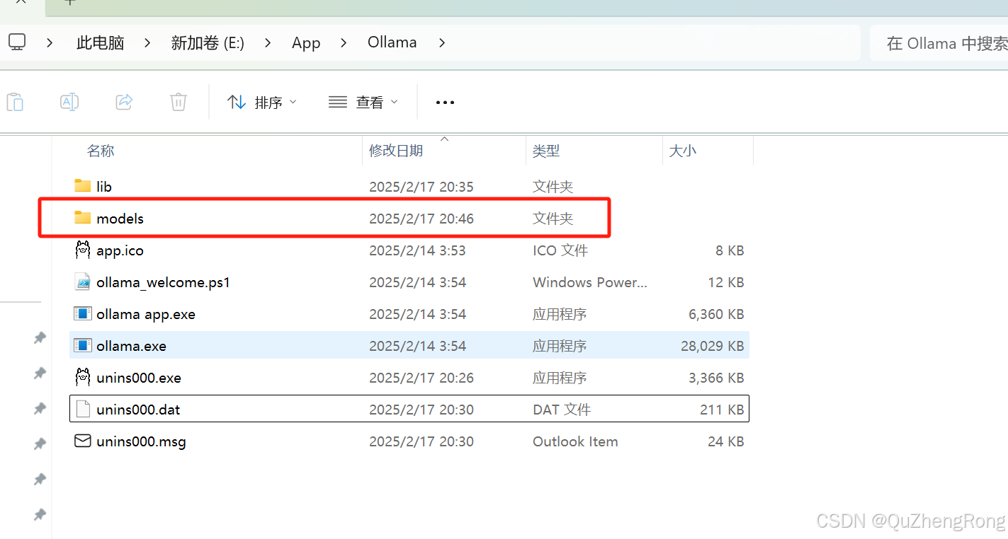 复制Ollama文件夹到D盘或其他任意磁盘,比如我是把文件夹放在E:\App目录下,同时创建一个叫models的文件夹,用来存放大模型文件
