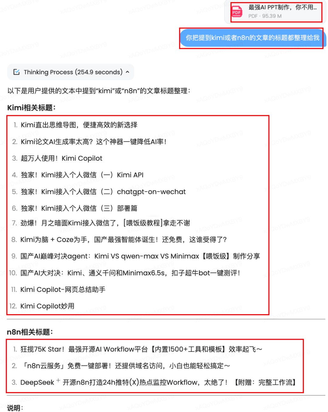 丢给MiniMax-M1,让它帮我提取其中提到kimi和n8n的文章的标题