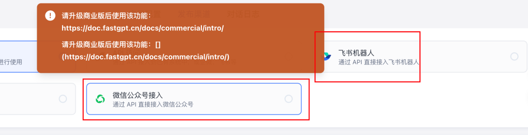 fastgpt有一些商业版才能用的功能,比如把bot一键发布到公众号,飞书机器人。