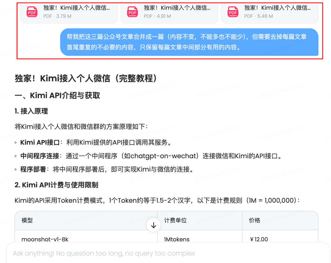 我把我去年写的kimi接入微信一、二、三丢过去,让MiniMax-M1合并文章的同时也"掐头去尾"。